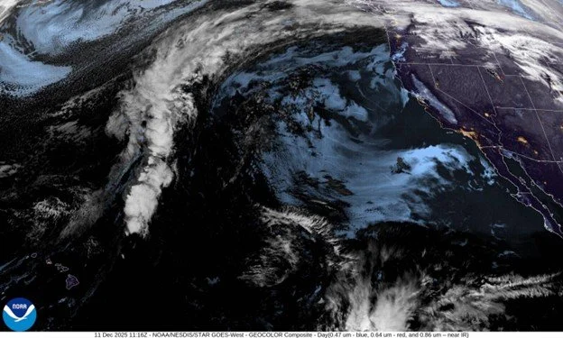 Satellite image of clouds (white) and fog/low marine clouds (light blue).