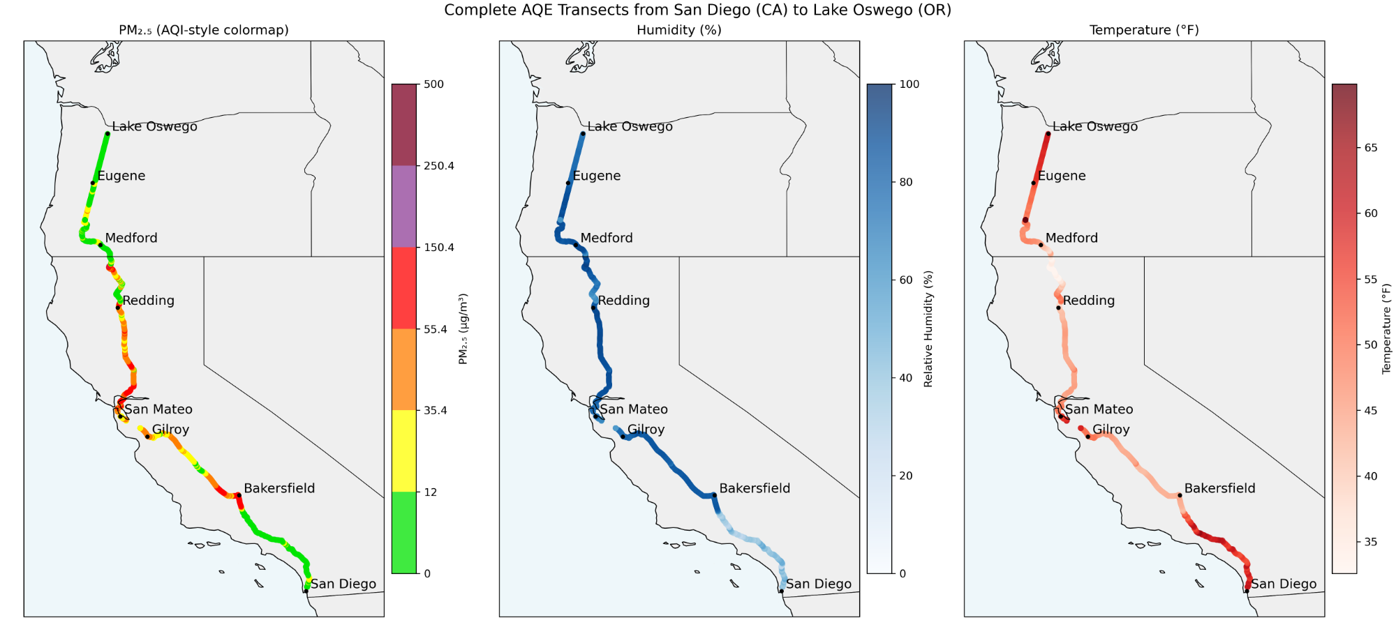 Figure 2. Same as figure one (Temperature, Humidity, PM), but for the second segment (Bakersfield to Palo Alto).
